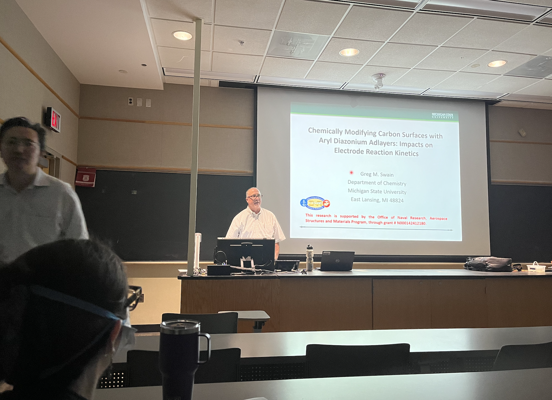 - Sep 24, 2025: Together with the Department of Chemistry, the ECS Detroit Student Chapter hosted Prof. Greg Swain from Michigan State University, and he gave an excellent talk titled "Chemically Modifying Carbon Surfaces with Aryl Diazonium Adlayers: Impacts on Electrode Reaction Kinetics".